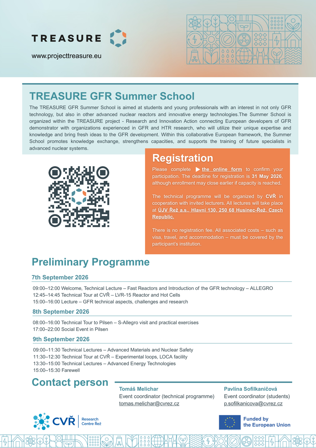 TREASURE GFR Summer School je vzdělávací akce určená studentům a mladým odborníkům, kteří se zajímají o technologii plynem chlazených reaktorů (GFR) a další pokročilé jaderné systémy. Cílem je sdílení znalostí, posílení kapacit a příprava nové generace specialistů v oblasti inovativních energetických technologií. Účastníci se během tří dnů seznámí s principy rychlých reaktorů, technologií GFR a výzvami, které tato oblast přináší. Program zahrnuje odborné přednášky, technické exkurze do výzkumných zařízení CVŘ, praktická cvičení v Plzni na zařízení S-Allegro a společenské eventy, který podpoří networking a výměnu zkušeností. Diskutovat se bude také o pokročilých materiálech, jaderné bezpečnosti a energetických technologiích budoucnosti. Účast na akci je bez registračního poplatku, náklady na cestu, ubytování a víza hradí účastník nebo jeho instituce.