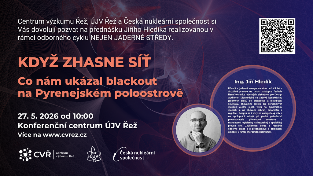 Centrum výzkumu Řež, ÚJV Řež a Česká nukleární společnost vás srdečně zvou na další pokračování odborného cyklu Nejen jaderné středy. Tentokrát se setkání zaměří na téma KDYŽ ZHASNE SÍŤ – Co nám ukázal blackout na Pyrenejském poloostrově, které se věnuje příčinám, průběhu a souvislostem rozsáhlého výpadku elektrizační soustavy a jeho významu pro stabilitu energetických sítí.